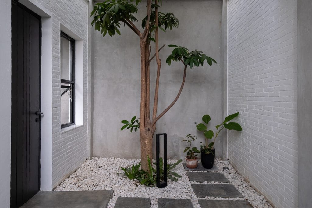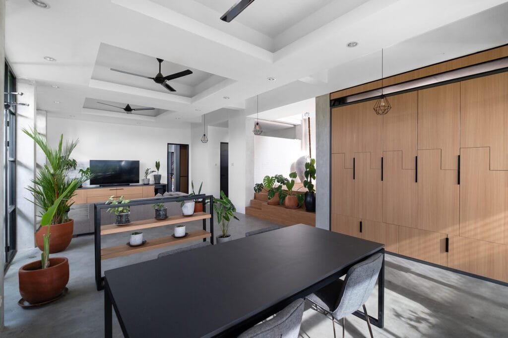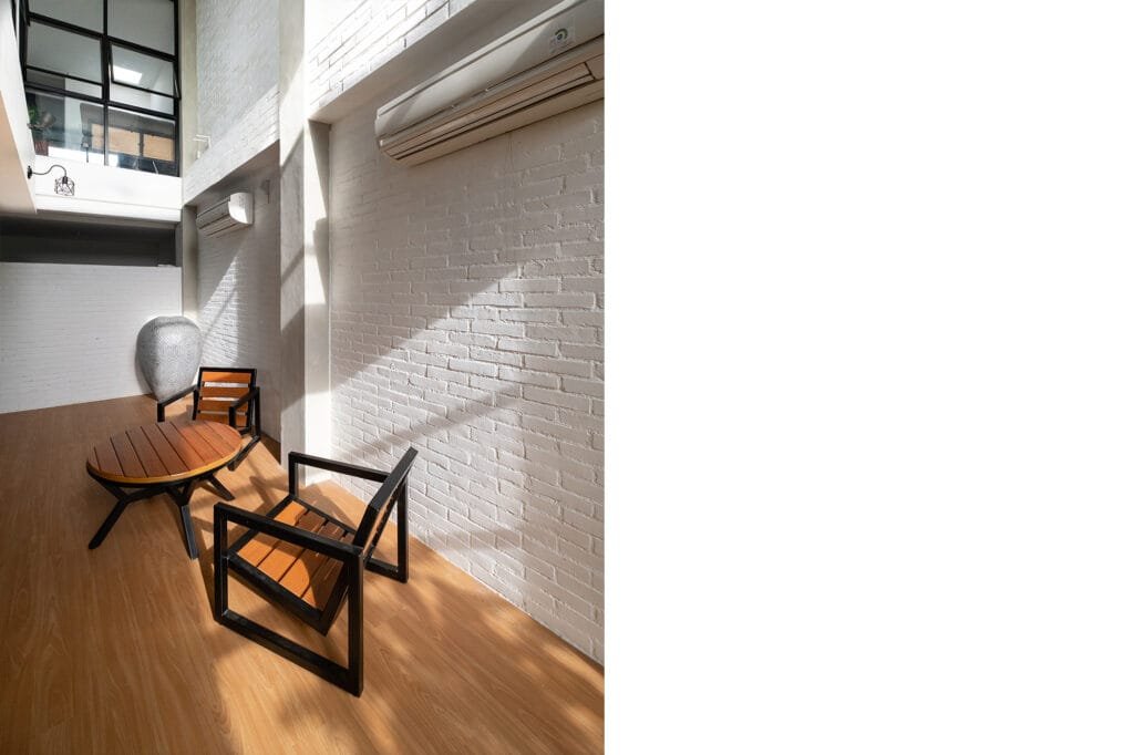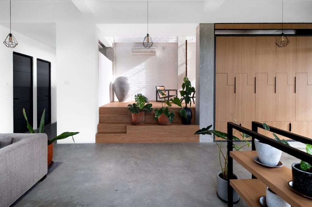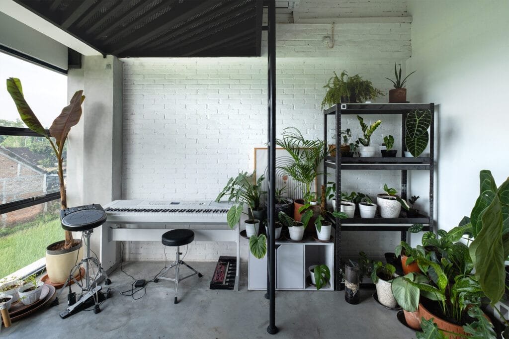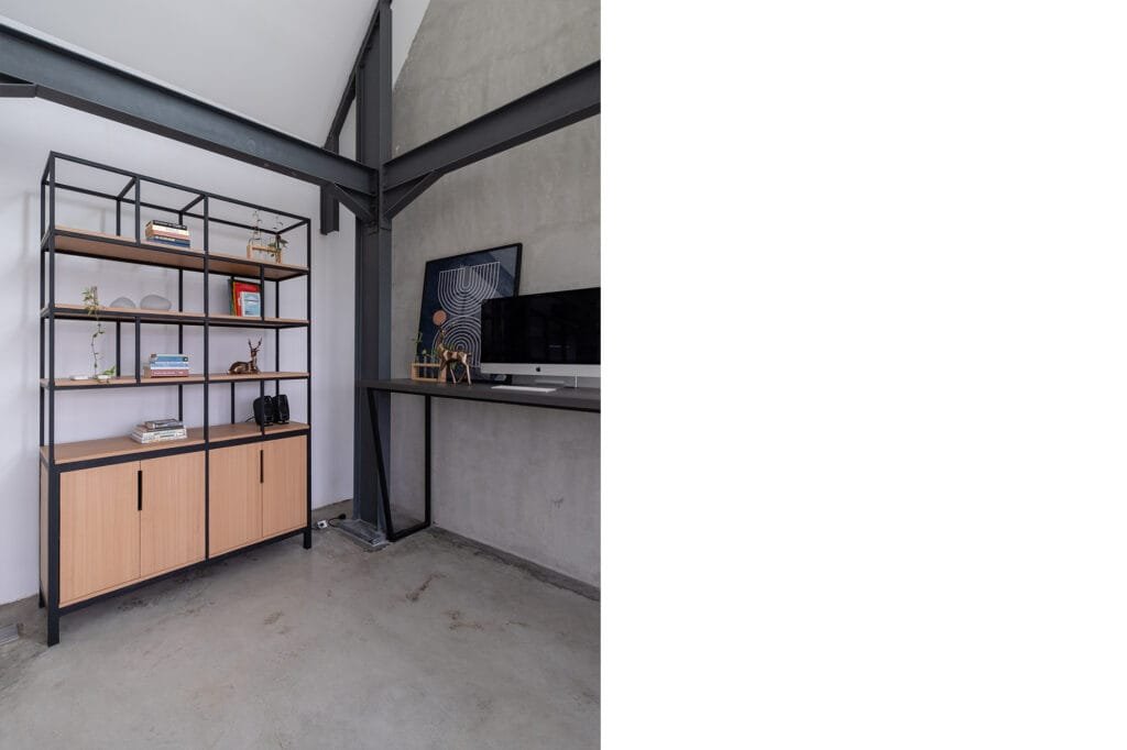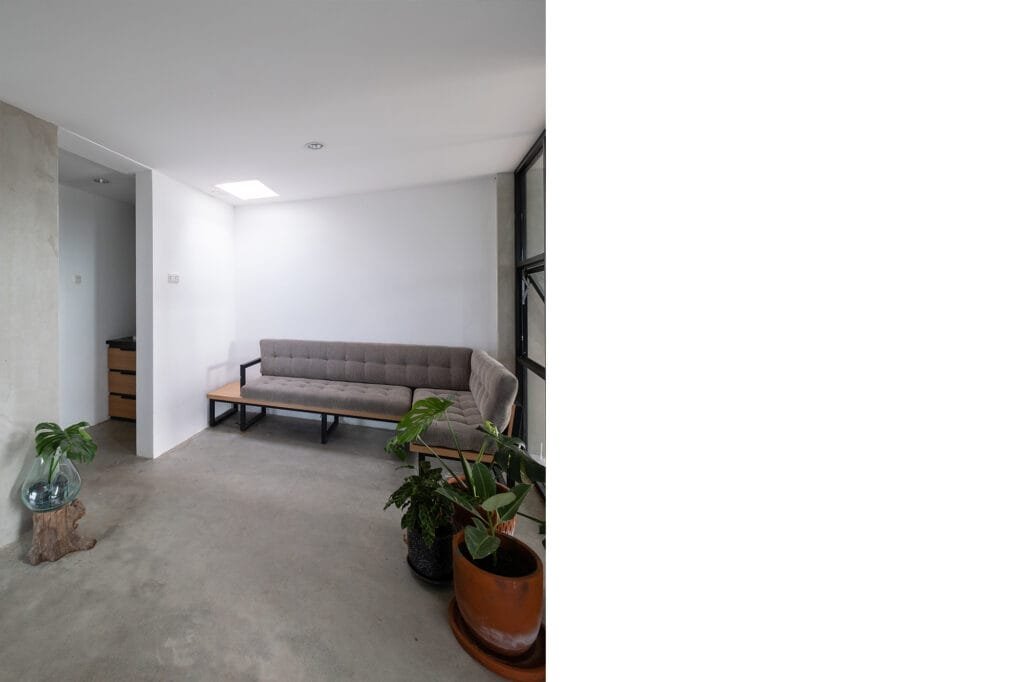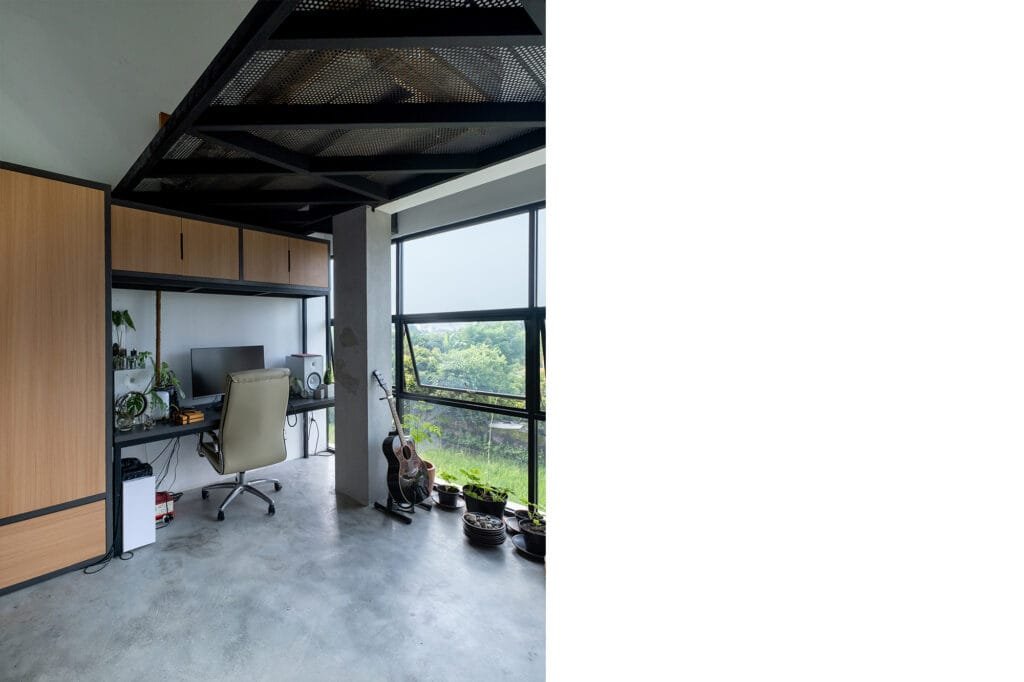 Keunikan lainnya adalah pemiliknya tinggal di kantor dan memiliki hobi seperti bermain musik dan mendekorasi tanaman. Pemilik juga membutuhkan ruang kerja, lemari pakaian, dan area tidur. Jadi, kami harus menciptakan ruang untuk menampung aktivitas dalam satu ruangan. Terakhir, di kamar tidur kami membuat ruang mezanin: area bawah untuk ruang kerja, lemari pakaian, tempat bermain piano atau gitar, dan dekorasi tanaman, sedangkan bagian atas adalah untuk area tidur.