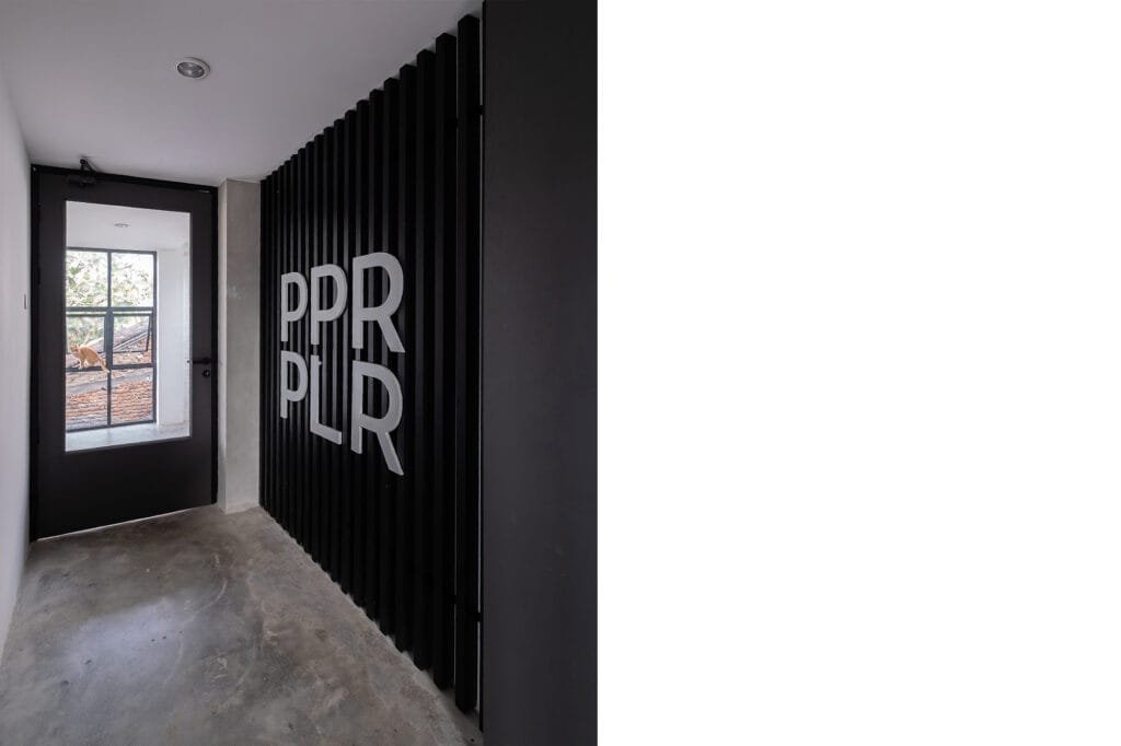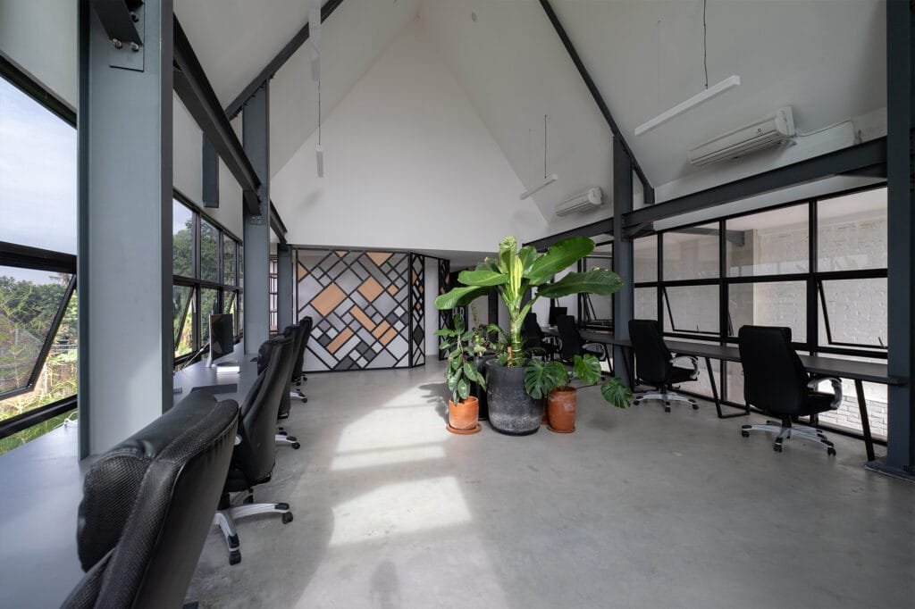 Kantor PDS memiliki sebuah keunikan, yaitu pemiliknya senang memelihara hewan terutama kucing. Ada beberapa kucing yang ikut tinggal, beraktivitas ke segala ruang dan berbaur dengan orang yang kerja di lantai atas. Lantai atas diisi dengan area kerja yang menghadap kaca di setiap sisinya untuk memaksimalkan pergerakan di dalam ruangan dan salah satu sisinya memiliki view untuk melihat aktivitas orang di sawah. Fitur lain di lantai atas adalah musala, area duduk, toilet, dan kamar tidur.