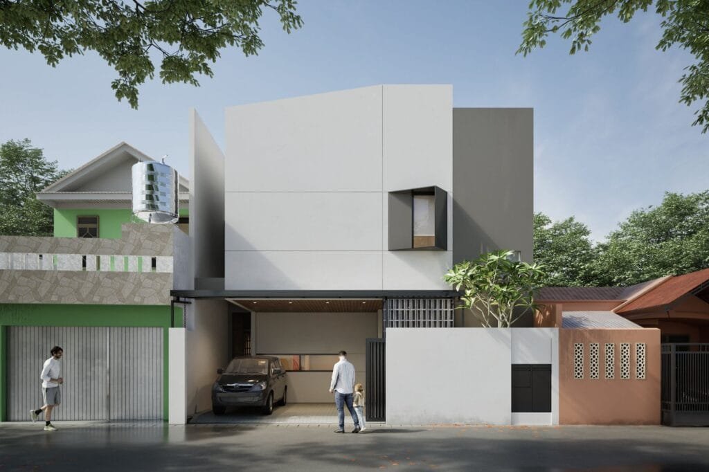 Massa bangunan disusun kompak, dengan orientasi tenggara yang menuntut strategi desain cermat untuk menjaga privasi penghuni sekaligus meminimalkan paparan sinar matahari langsung. Fasad depan tampil tertutup, hanya diberi aksen satu jendela dengan topian menyerong—menjadi detail yang estetis sekaligus fungsional.