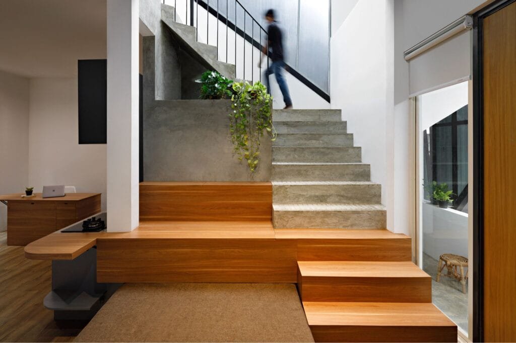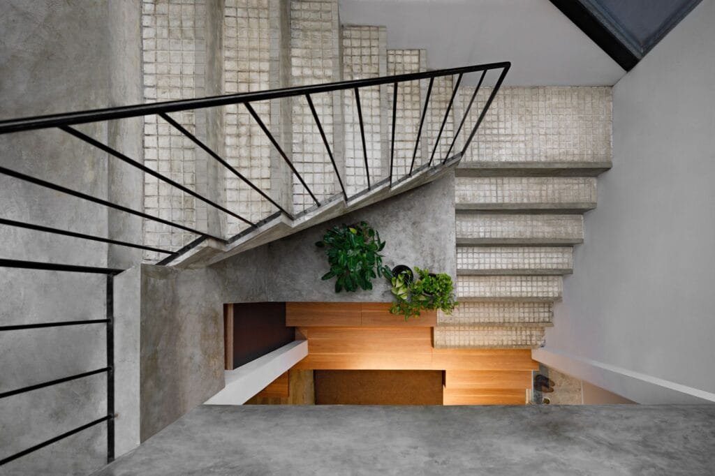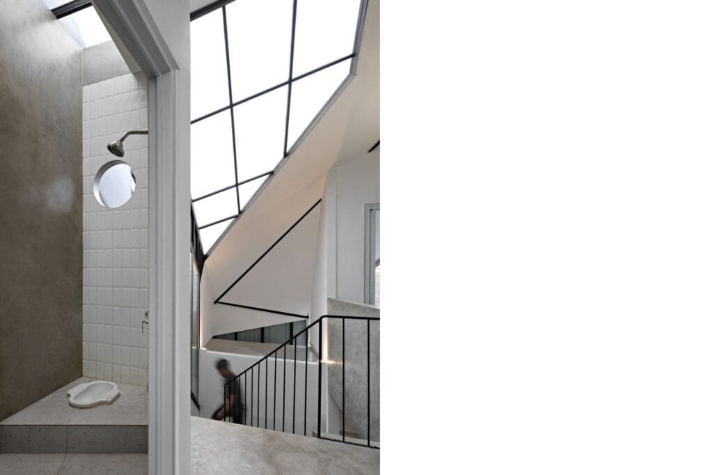 Ndalem Binerkatan memadukan keinginan untuk tampil, keputusan batas biaya, dan kebutuhan akan nilai guna. Sudut pada tangga dan toilet didesain untuk memberi ruang pada bukaan cahaya di lorong samping, yang sekaligus jadi akses pintu kedua untuk keluar dari rumah dengan lebar 6 m ini. Atap yang miring dan menantang bukan hanya didesain untuk mengejar tampilan, melainkan memangkas adanya dinding penahan atau gunungan atap yang tidak perlu. Tatanan ruang dan kemiringannya juga didesain sedemikian rupa agar bisa menjadi bidang masuknya cahaya baik untuk lantai bawah maupun atasnya.