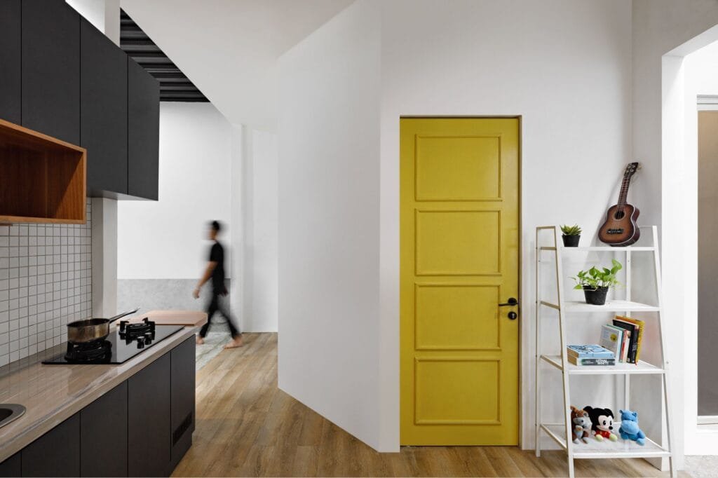 Pintu eksisting digunakan kembali dengan adaptasi berupa penghilangan kusen yang sudah tidak cocok dan kurang layak. Warna eksisting kuning dipertegas sebagai simpul memori dari rumah lama sekaligus aksen yang mencuat di rumah yang telah direnovasi ini. Letak pintu juga diatur agar tidak berada di sudut ruang kamar, sebagai pemisah antara lemari/ruang simpan pakaian dengan sudut miring dan tempat tidur. Keputusan yang sederhana namun jarang ditemukan di rumah developer pada umumnya.